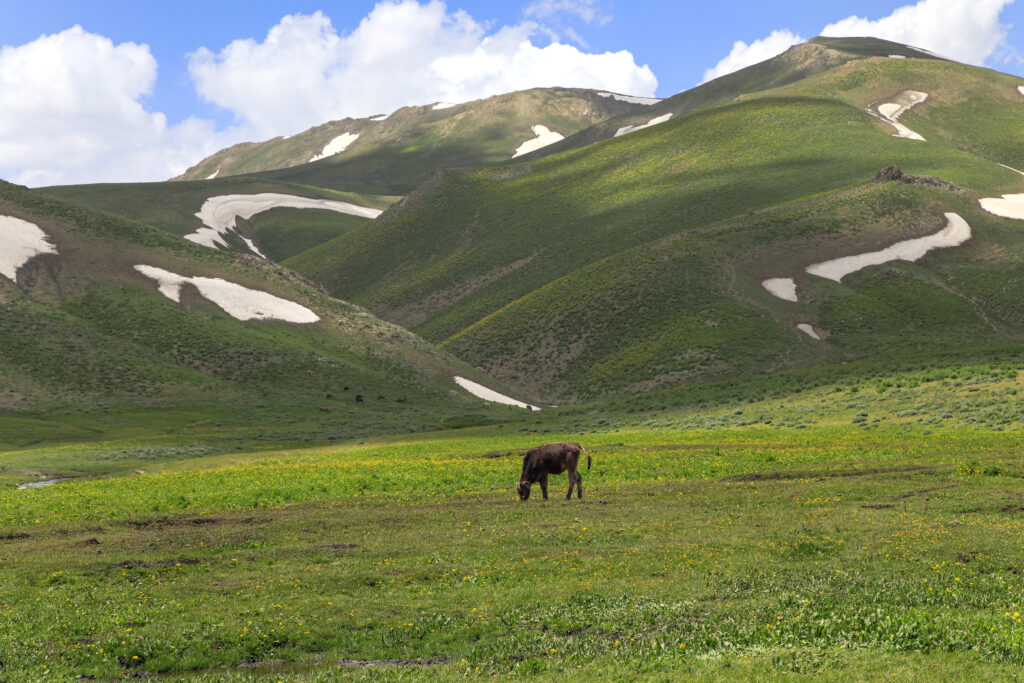 Daha yola çıkmamızla birlikte manzara yine olağanüstü bir doğa güzelliği sundu bize. Karşıdaki dağların üstünde ve aşağısında yeşilin tüm tonları mevcut, arkasındaki çıplak yamaçlar ise karla örtülüydü. Bu sabah Cilo Dağı’nın diğer tarafındaydım. Manzara yine büyüleyici ama bu kez dağların arasında derin bir vadide değil, geniş bir yayladaydık. Dik ve sert yamaçlar uzağımızda kalmış, yeşilin tonları, berrak gökyüzünün pofuduk bulutlarının altında nazikçe yuvarlanan tepelerin üstünden uzayıp gidiyor; tepelerin üzerine serpilmiş kar öbekleri dağa taşa damalı ineğe benzer bir görüntü veriyordu. Ve tabii bu büyük genişliğin içinde farklı konumlarda koyun sürüleri, çobanları ve köpekleri ile serbest dolaşan atları manzarayı süslüyordu.